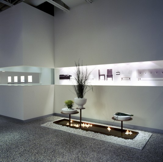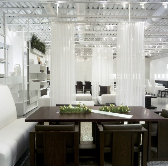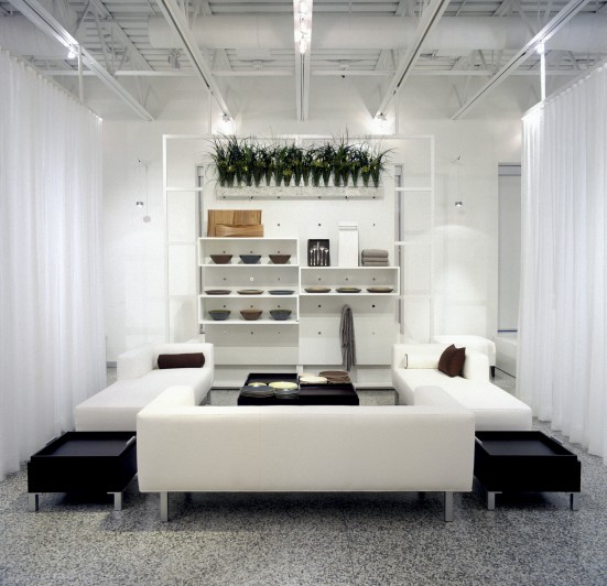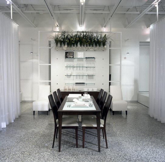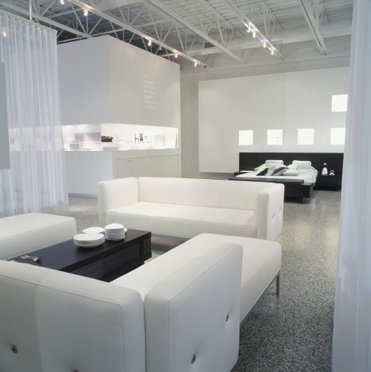 In a fresh approach to product display, complete living-environments are presented in room vignettes, delineated by moveable, sheer, ripple-fold curtains. The dimensions of the vignettes – and the multi-functionality of the furnishings – reflect the reality of reduced room sizes in today’s space-challenged urban communities.
