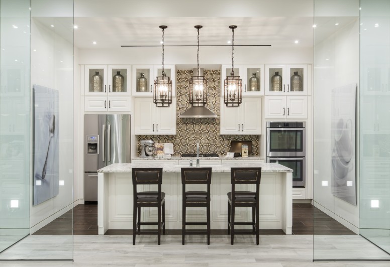Design studio for new homeowners; coffee bar; inspiration corridor with kitchen and bath vignettes, video wall; selection areas for Ashton Woods' finishes, fixtures and fittings; lounge and demonstration kitchen