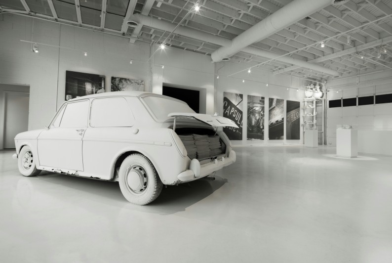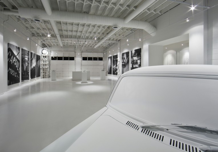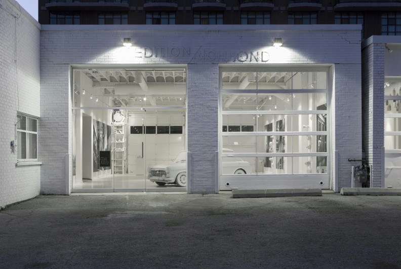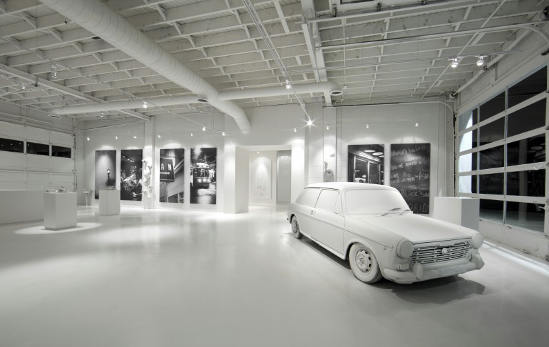 The garage-turned-gallery has been maintained in its original, raw state though repaired and whitewashed. White floors, walls and ceiling lend an ethereal quality to the transformed space, signifying a transition from the mundane to the extraordinary.