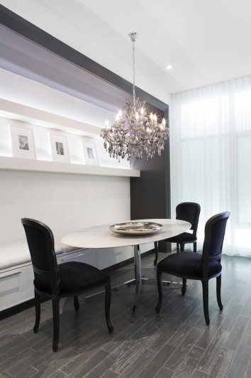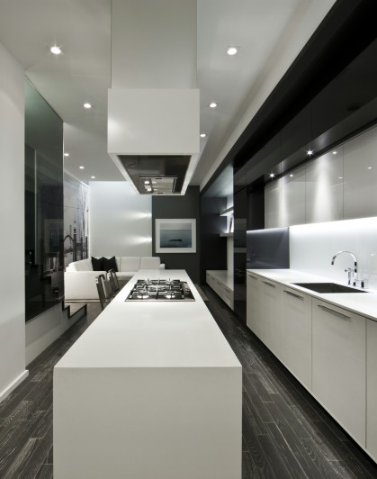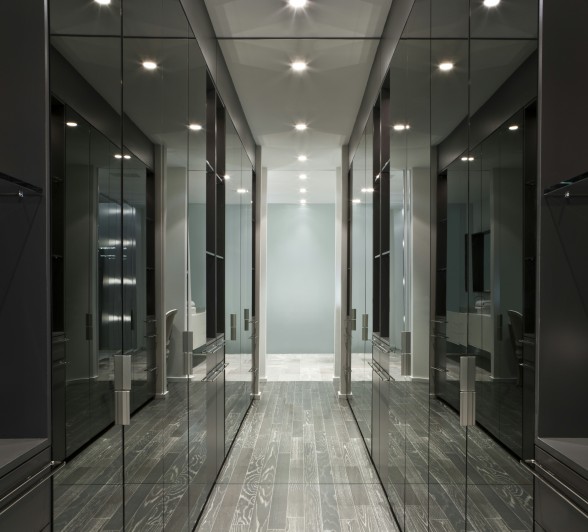 The adjacent model suite, polished and tucked away, features sleek finishes and jewel-like accents joining a fluid live-cook-dine area, dressing area and bath area. Carefully-edited furnishings underscore the notion of living space as an unobtrusive container, a volume for layering in personal effects and mementos over time.